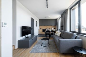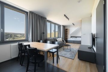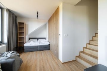 Modern eingerichtetes zweistöckiges 2,5-Zimmer-Appartement plus Küchenzeile mit einer Schlafcouch erster Wahl im Wohnbereich, die ausgeklappt zu einem vollwertigen Bett wird, und einem optisch abgetrennten Schlafbereich mit einem Doppelbett. Das Schlafzimmer im Obergeschoss ist mit einem klassischen Doppelbett ausgestattet. Das Appartement der Kategorie Familie E verfügt über einen LCD-Fernseher, eine komplett ausgestattete Küchenzeile mit allen Kochutensilien, Kochplatte, Mikrowellenherd, Kühlschrank, Wasserkocher und Nespresso-Kaffeemaschine. Ein separates WC und ein Badezimmer mit Dusche, Handtüchern, Badetüchern und Haartrockner neben dem Schlafzimmer sind Standard. Das Familien-E-Appartement verfügt über ausreichend Stauraum und bietet eine komfortable Unterkunft für eine Gruppe von Freunden oder eine Familie mit Kindern.