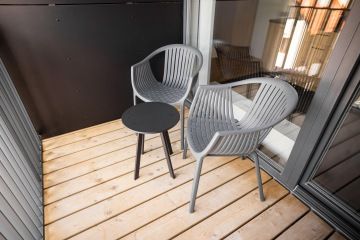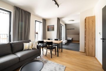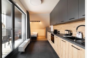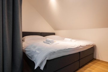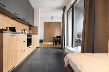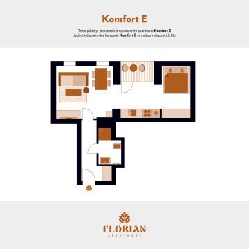 Moderně zařízené, prostorné 1,5+kk s kvalitní rozkládací sedačkou v obytné místnosti, ze které po rozložení vznikne plnohodnotná postel a opticky odděleným spacím koutem s manželskou postelí. Apartmány kategorie Komfort E disponují LCD televizí, kuchyňkou plně vybavenou potřebami k vaření, varnou deskou, troubou kombinovanou s mikrovlnkou, lednicí, varnou konvicí a kávovarem Nespresso. Vlastní koupelna se sprchovým koutem, ručníky, osuškami a fénem je samozřejmostí. Apartmány Komfort E disponují dostatkem úložných prostor a nabízejí komfortní ubytování pro skupinku přátel, či rodinu s dětmi. Všechny mají vlastní terasu, či lodžii.