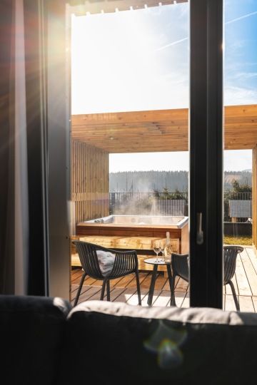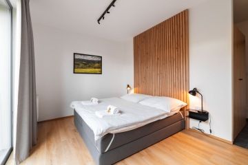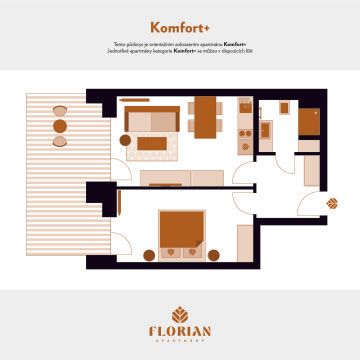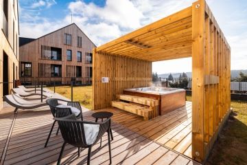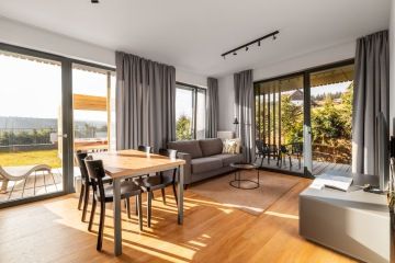 Moderně zařízené 2+kk s privátní vířivkou na terase apartmánu a krásnym výhledem, kvalitní rozkládací sedačkou, ze které po rozložení vznikne plnohodnotná postel a ložnicí s manželskou postelí. Apartmány kategorie Komfort+ disponují LCD televizí, kuchyňkou plně vybavenou potřebami k vaření, varnou deskou, troubou kombinovanou s mikrovlnkou, lednicí, varnou konvicí a kávovarem Nespresso. Vlastní koupelna se sprchovým koutem, ručníky, osuškami a fénem je samozřejmostí. Apartmány Komfort+ disponují dostatkem úložných prostor a nabízejí komfortní ubytování pro skupinku přátel, či rodinu s dětmi. Všechny mají vlastní terasu, či lodžii.