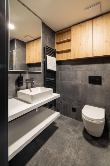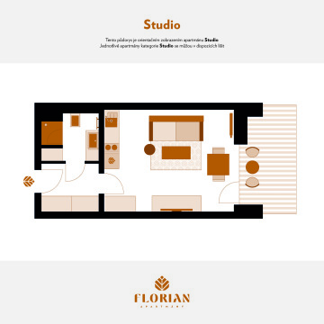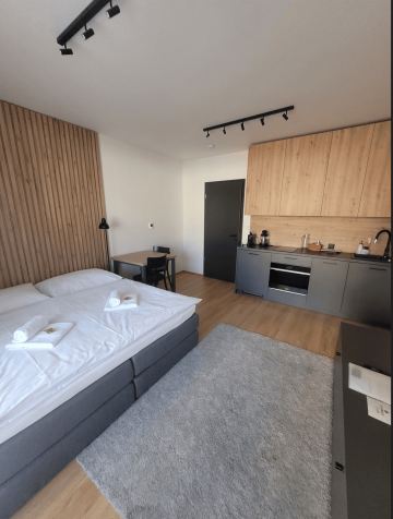 Moderně zařízené, prostorné 1+kk s dvojlůžkovou postelí. Ideální pro 2 dospělé osoby. Apartmány kategorie Studio disponují LCD televizí, kuchyňkou plně vybavenou potřebami k vaření, varnou deskou, troubou kombinovanou s mikrovlnkou, lednicí, varnou konvicí a kávovarem Nespresso. Vlastní koupelna se sprchovým koutem, ručníky, osuškami a fénem je samozřejmostí. Apartmány Studio i přesto, že patří mezi menší, disponují dostatkem úložných prostor a poskytují komfortní ubytování pro páry, či jednotlivce. Všechny mají vlastní terasu, či lodžii.