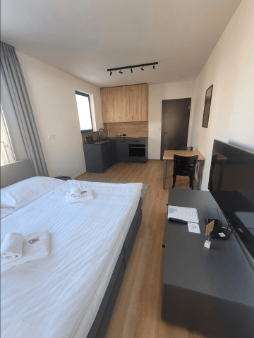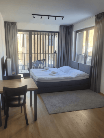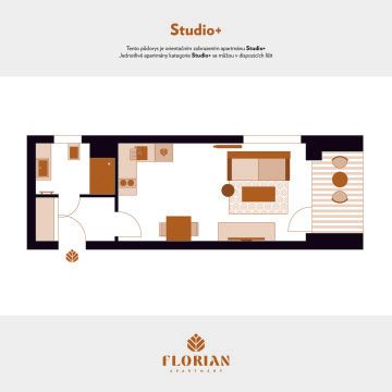Moderně zařízené, prostorné 1+kk s dvjolůžkovou postelí. Ideální pro 2 dospělé osoby, popř. s miminkem do 2 let včetně (do apartmánu je možné přidat dětskou postýlku). Apartmány kategorie Studio+ disponují LCD televizí, kuchyňkou plně vybavenou potřebami k vaření, varnou deskou, troubou kombinovanou s mikrovlnkou, lednicí, varnou konvicí a kávovarem Nespresso. Vlastní koupelna se sprchovým koutem, ručníky, osuškami a fénem je samozřejmostí. Apartmány Studio+ i přesto, že patří mezi menší, disponují dostatkem úložných prostor a nabízí komfortní ubytování pro jednotlivce, či páry s miminkem. Všechny mají vlastní terasu, či lodžii.
