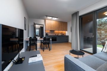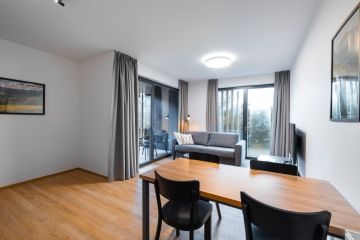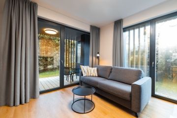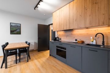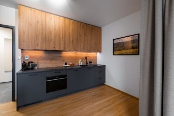 Pokoj určen speciálně pro hosty s pejskem. Moderně zařízené, prostorné 1+kk s kvalitní rozkládací sedačkou, ze které po rozložení vznikne plnohodnotná postel. Ideální pro 2 dospělé osoby, popř. s miminkem do 2 let včetně (do apartmánu je možné přidat dětskou postýlku). Apartmány kategorie Studio+ disponují LCD televizí, kuchyňkou plně vybavenou potřebami k vaření, varnou deskou, troubou kombinovanou s mikrovlnkou, lednicí, varnou konvicí a kávovarem Nespresso. Vlastní koupelna se sprchovým koutem, ručníky, osuškami a fénem je samozřejmostí. Apartmány Studio+ i přesto, že patří mezi menší, disponují dostatkem úložných prostor a nabízí komfortní ubytování pro jednotlivce, či páry s miminkem. Všechny mají vlastní terasu, či lodžii.