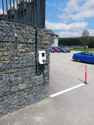Nabíječka pro elektroauta od společnosti E.ON je umístěna na jižní straně kamenné zdi budovy A (za rohem od našich 3 vyznačených parkovacích míst navazujících na obecní parkoviště). Naši hosté mohou stát a nabíjet na našem parkovacím místě.